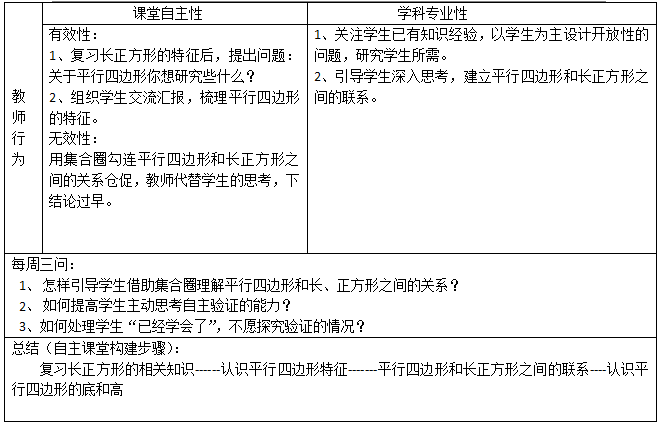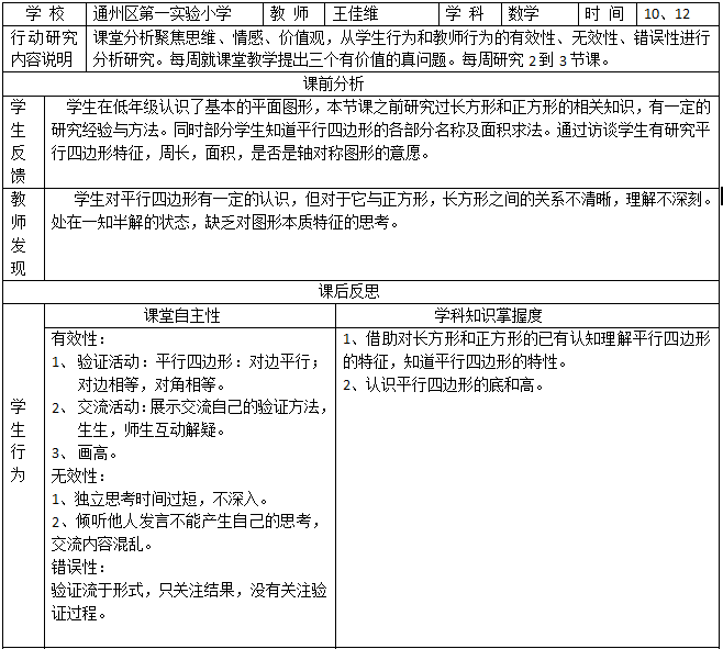 王佳维老师 1 教师介绍 王佳维,是北京教育科学研究院通州区第一实验小学的一名数学老师。教学二十年,王老师认为每个人都是天生的学习者。当今社会随着科学技术的迅速发展,信息与知识的急剧增长,知识更新的周期缩短,创新的频率加快,对人的素质的要求也在提高,作为社会人就应该在不断学习中适应社会发展需求,作为一个教育者更应该把学习作为一种责任,主动学习,持久性学习,完成教育的的使命。对于自主教育,王老师认为自主教育就是要培养人的自主思维能力,培养人观察、发现、思考、辨别、体验和领悟等能力。通过自主教育可以促使教师成为更好的实施发现教育的教育者。 2 学习心得 关于问题串的时间与思考 在钱守望老师的培训中,教师的三个抓手“情境,学材,问题串”让我产生很多的思考。尤其在问题串的设计上,我觉得一节好课,好的问题是一节课的灵魂,好的问题可以增强课堂的时效性,学生学得不累,易于知识系统的形成,对于学生长远的学习起到很好的作用。在阅读《促进小学生数学思维发展的有效策略》一书时,有效设计大问题的解读中也说到,在大问题的设计中,好的大问题可以使学生的主体地位得到根本的保障,教师过多,过于频繁的提问,只会让孩子失去自己的思考或者自己的思考被打乱,没有自己思考的时间和空间,直接导致学生的问题思维质量下降。小问题过多,课堂教学被一个个小的知识点的讲解占用,学生对知识的理解与掌握不够系统化。 基于以上的学习与思考,我认为加强自身课堂教学的问题设计能力的提升,对自己的教学时效性会有较大的帮助。 因此,在平行四边形、梯形和三角形一单元的教学中,我做了以下的尝试。 第一课时:平行四边形的认识 1、我们都认识过哪些平面图形?(黑板上顺序贴出长方形,正方形,平行四边形,梯形,三角形,圆形)。 2、关于长方形和正方形你学习过哪些知识? 3、关于平行四边形你想研究什么?(板书:什么是?周长,面积,轴对称?内角和?……) 4、在认识长方形和正方形的特征时,我们是从哪些方面来研究的?(板书:边,角) 5、观察并思考,长方形、正方形和平行四边形有什么相同点有什么不同点? 第二课时:平行四边形的面积 1、 平行四边形的面积怎样求? 2、 (基于学生生成)9乘4和9成4.5,你认为哪个正确?(底乘高/底乘邻边) 验证自己的想法。 第三课时:平行四边形的应用 有一项画平行四边形的练习:画一个底为5厘米,高为3厘米的平行四边形。 1、谁还能画一个以这个平行四边形的5厘米为底,以3厘米为高的不同的平行四边形?还有谁能再画一个? 2、观察这几个平行四边形,你有什么发现? 通过这些教学问题的设计与思考,我把平行四边形这一平面图形的知识点串了起来,每节课之间具有连续性,边回顾边接受新的知识,即建立了平面图形之间的联系,也拓展了对图形的进一步认识。这个学习模式,引入到梯形和三角形的学习中,学生可以自己独立研究,教师辅助整理解疑即可。 好的问题的设计需要精心的揣摩,教师要读懂教材,把握知识的重难点,有效整合所授知识,同时也要读懂学生,以学生已有知识经验为基础。 本次尝试后,还有一种思考,如果把四边形和三边形的认识作为一条线来教学,再把他们的面积教学作为一条线俩教学,哪个更符合学生的认知,课堂时效性更强呢? 3 行动管理表展示 |