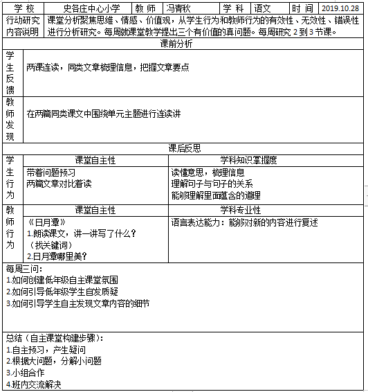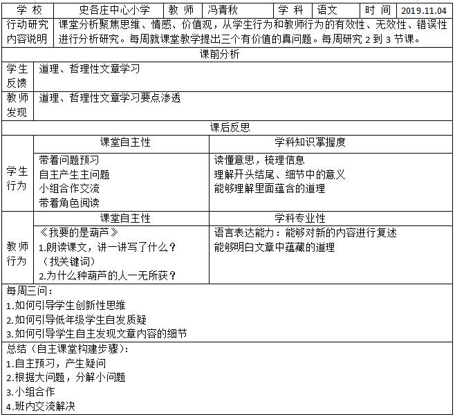教师介绍 冯青秋,是史各庄中心小学的一名语文老师。在自主教育研修的这段时间中,冯老师不仅收获了许多教学上的建议,还获得了思维上的转化。今天,冯老师将和我们一起分享她在研修中的收获和感悟。 学习心得 本周阅读了《经典诗文主题性综合实践活动的探索与实践》等文章,受益匪浅。我认为:作为一个语文教师,能给学生留下点什么呢?仅仅是答题技巧和考试的方法吗?引导学生喜欢阅读、学会阅读,养成良好阅读思考习惯,不仅能使学生轻松的提高语文成绩,更重要的是帮助学生推开一扇通向世界和心灵的窗户,使学生快乐健康的成长。书,充满无形的力量,融入血脉,化作灵魂,潜移默化中,影响着一个人,塑造着一个人。如片片叶舒展开来,织成森林浩瀚;如滴滴水珠滋润心灵的原野,汇成汪洋大海。教师要带领学生走进更加广阔的世界,让学生的眼界、心界更加广阔。让修养影响修养。教师要具备高尚的人格修养,学生对教师就会更加喜爱和尊重,从而促使教师努力丰富和发展自己的情操与涵养。 本周我阅读了《家庭作业提升小学生自主学习关键能力的条件和对策 ——基于小学语文家庭作业的分析视角》等文章,受益匪浅。总结认为:自主学习对于学生的创造性思维和创新能力的培养至关重要;另一方面,其对促进学习者自主性和个性的发挥,促进全面发展起到了重要作用。而家庭作业的设计,与学生自主学习能力的培养密切相关。 我们认为家庭作业中必然存在以应试为目的的部分作业。其以解题套路训练为主,对学生自主学习能力的发展作用甚微。而家庭作业中的“自主作业”部分对小学生自主学习能力的提升具有重要作用。笔者认为“自主作业”包含两方面含义:1.“自主作业”的布置并非完全由教师决定,而是给予了学生在作业内容、形式和完成方法等方面一定的自主权,小学生可以通过此自主权进行一定程度的自主探究。2.“自主作业”的一个重要的功能即培养学生的自主学习能力。通过“自主作业”的布置,激发学生学习兴趣,进行学习目标和方法等的引导,从而达到培养自主学习能力的作用。 家庭作业是提升小学生自主学习能力的重要方式之一,从语文学科角度出发,我十分认同作者的观点--小学生语文自主学习能力有4个关键:为实践、观察、阅读和探究。实践是语言运用的关键、观察是审美的基础、阅读是语文学习的必要、探究是自主学习的重点。 实际改变: 结合学习材料,通过“自主作业”的布置,激发学生学习兴趣,进行学习目标和方法等的引导,从而达到培养自主学习能力的作用。 行动管理表