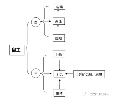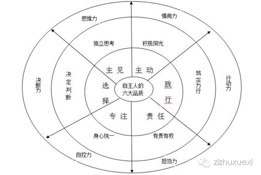 自知、自律和自强的关系 从人的发展纵向过程上讲自知是基石,自律是机制,自强是目标。 自知是人成长发展的基石,不论个体或团体在对自我这个主体的本身、环境、时代、背景等方面综合了解的基础上更好的去谋求发展. 自律是人发展过程中的机制,在成长的路上不断用制度和方法引导、支撑、鼓励着主体的成长发展。 自强是人成长发展的终极追求目标,每个个体的自强凝聚成国家的繁荣富强,国家繁荣富强促进个体更大潜能的发挥。 主体、主见和主动三者之间的关系 从人的内在发展阶段方面看,人以主动的精神促进主体按自身的特点去发展。 主体是人发展的本位,是内外因素促进的对象。 主见是主体的见解。是主体的核心和灵魂,是个体发展的方向标。在发展的过程中时时处处主动思考、独立判断,确定人生发展的方向和路径,侧重于思维的主体性。 主动是主体内在精神的外显表现,是主体内在诉求的行动落实。 自主的灵魂是主见,一个有主见的主体才能客观地认识自己、规划自己、管理自己、引导自己按适合自己的路径去主动发展,积极探索将自己的潜能发挥到极致,达到自胜自强。 结合以上六个维度,自主是个体或团体在自我认知的基础上,根据自身的特点和需求,整合内外力量,主动思考、独立判断,选择适合自己的路径,以自我为主体,按自己的步伐积极稳健地发展,追求自立自强,将自己的所有潜力发挥到极致的过程。 简言之自主是做自己、靠自己。勇敢做自己,坚持做自己,智慧做自己,做向上的、向善的、积极的自己;在强调本主体的自主发展的同时尊重他主体合理的自主。做自己主体不仅要有想法,更要能行动,要独立思考、笃实行动、思行并举、自主发展。 自主人的六大品质 主见---独立思考---思维力 主动---积极阳光---情商力 选择---决定判断---决断力 专注---身心统一---自控力 践行---笃实力行---行动力 责任---有责有权---担当力 图2. 自主教育的六大品质 正如上所述,主见和主动是自主人的灵魂和行为的驱动力,主见主要反映个体的独立思考,体现个体的思维力;主动反映个体行为的状态,自主人积极阳光,处理事情保持乐观态度,表现为个体的情商力;选择主要反映个体处理事情的判断能力和果断的态度,体现个体的决断力;专注主要反映个体处理事情过程中的身心统一,全神贯注,不受干扰,不开小差,为一个目标坚持不懈,体现为个体的自控力;践行主要反映个体处理事情过程中的效率,笃实力行,不虚夸,脚踏实地,行之有效,体现为个体的行动力;责任则主要反映个体对所处理事情以及事情结果的态度,要敢做敢为,用于承担责任,不推卸责任,体现为个体的担当力。 自主人的发展阶段
