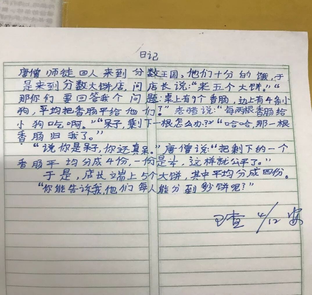 最近读了一篇关于怎么提升孩子数学阅读能力的文章,文章里给了一些建议,其中让学生写数学日子这个点子我觉得不错,引导学生思考日常经验联系上数学知识,,会让学生对数学应用有更深的理解。当然日记的形式就不用像语文那样规范,比如,画图,列式,画图,这里面无形中加入数学符号区别语言记录。