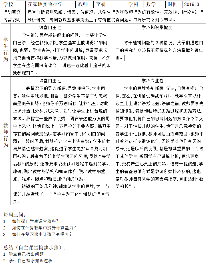 教师介绍 李妍 李妍,是花家地实验小学的一名数学老师,已有八年教龄。在自主教育研修中,李老师认为自主教育是培养受教育者的主体意识和学习能力,促进其主动发展的终生教育。在课堂教学中,李老师力求每节课在情境中进入主题,在操作中体会,并建立模型,最后内化成学生自身的知识储备。对于教育,要慢下来,静待花开。 小学数学教学生活化 读后感 鲁迅先生说:“没有兴趣的的学习,无异于一种苦役;没有兴趣的地方,就没有智慧和灵感。”教材中生活化情境就比较多。如:一年级下册“生活中的数”单元采用的情景图就是学生所熟知的“数铅笔”;第六单元“购物”呈现给学生的是文具商店货架;三年级“对称、平移和旋转”单元则出示了许多美丽的剪纸……,教学情景图的作用体现在数学知识生活化,创设了与学生生活环境、知识背景密切相关的、又是学生感兴趣的学习情境,使学生感觉到在课堂上学习就像在日常生活中遇到了数学问题一样。不知不觉中由内在兴奋转化为外在兴奋,将参与欲望外化为参与教学活动的行为。教学中利用学生的生活经验,设计生动有趣、直观形象的数学情境,使数学知识成为看得见、摸得着、听得到的现实,让抽象的数学贴近生活,让多彩的生活为数学服务。创设各种学生喜闻乐见的生活情境,唤起学生的学习兴趣,诱发学生思维的欲望。例如:在教学“20以内数的加减法”时,可以创设玩扑克牌游戏,每人找出1-10的牌,同桌合作每人任抽一张牌,再把两张牌上的数合起来,然后,说出两道加法算式,两道减法算式。让学生在玩中学,学中玩,把枯燥的数字加减运算融入玩扑克牌的游戏中,学生兴趣盎然,每个人都动手、动口、动脑,个个积极投入其中,这样将每位学生的思维都激活起来。又如在教学“小数加减法”时,原有的教学范例已经不符合学生的认知特点,我们从学校的实际出发,把原来的例题改为:下面是开发区中心小学食堂价目表,你中午打算买哪几样菜,算一算,你要花多少钱?学生自然很感兴趣。这样不仅调动了学生的学习兴趣和欲望,更主要的是学生在宽松的氛围中自主轻松的学会了小数的加减法。 在教学中,我们教师要有意识地把日常生活问题数学化,使学生逐步具备在日常生活和社会生活中运用数学的“本领”,使他们认识到“数学是生活的组成部分,生活上处处离不开数学”,要养成事事、时时、处处吸收运用数学知识的习惯,调动他们主动学习数学、创新性运用数学的积极性.例如,在低年级教学中,我就提出这样的问题,你今年几岁啦?多高呀?身体有多重?比一比你和你同桌谁重……这些都是小学生经常遇到的问题,而要准确地说出结果,就需要我们量一量、称一称、算一算,这些都离不开数学。再如,生活中常用的各种知识像按比例分配水电费、计算储蓄利息、日常购物问题均发生在身边,我们买东西、做衣服、外出旅游,都离不开数学。在教学四年级“求平均数问题”内容时,我在课前布置了这样一个预习题:请同学们回家后到超市去进行一项社会调查,调查同一类商品的5种不同价格,看一看哪种牌子的最贵?哪种牌子的最便宜?算一算他们平均价是多少?让学生用学过的知识来解决日常生活中的问题,不仅激发了学习兴趣,而且能提高学生用所学知识解决实际问题的能力,让数学走向生活。 行动管理表展示 |