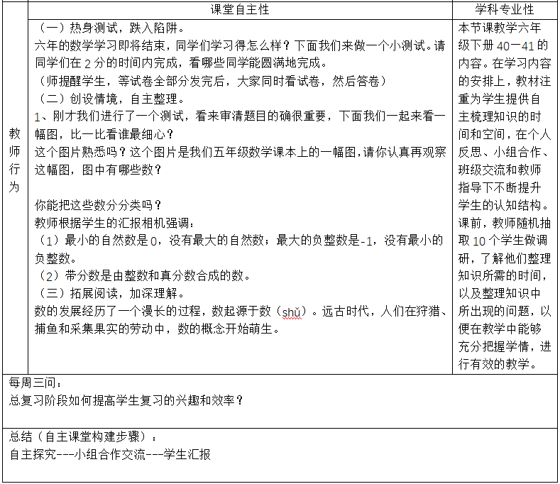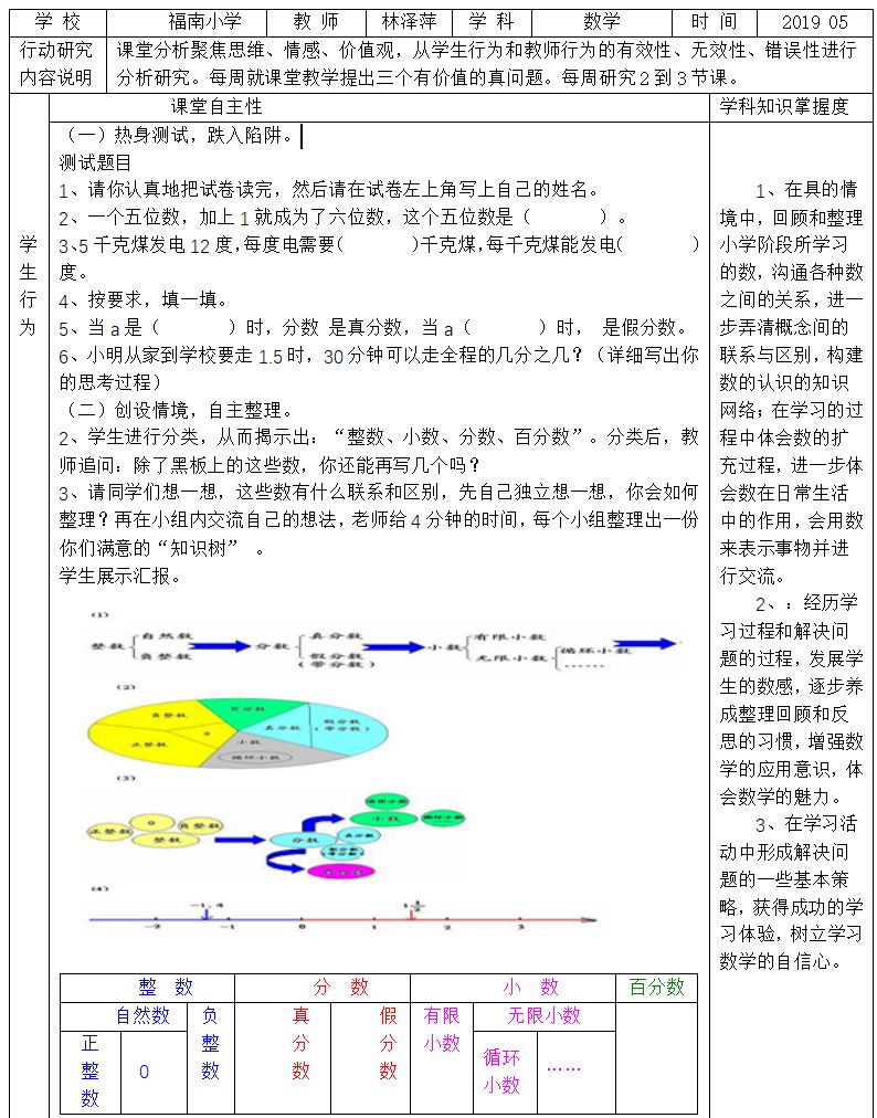 教师介绍:林泽萍,是深圳市福南小学的一名数学老师。自毕业以来,林老师一直从事小学数学教学工作,热爱教育事业,并且十分注重对教学方法和教育方式的研究,努力让孩子在课堂中不仅能学习到数学知识,更能深深地爱上数学这一学科,感受学习数学的乐趣。林老师曾获2017年福田区小学数学说课比赛一等奖。制作的课件《小明的一天》、《花园》获深圳市福田区数学基本功课件制作比赛一等奖,多次承担学校对内外公开课,接待课任务,得到领导老师们的好评! ZIZHU 01 自主研修心得 关注差异,以生为本 ------以吴正宪老师《归一问题》一课为例 谈及一堂好课,我认为最该关注两方面:教什么?怎么教?“教什么”是我们展开教学活动的基础,但这不意味着“怎么教”就不重要了。“怎么教”体现了一个老师的教学理念、教学方法、教学智慧等等。那么,“怎么教”最该关注的是什么呢?吴正宪老师《归一问题》一课给了我很大的启示。以下,以吴老师的课为例,谈谈我的几点想法。 本节课,吴老师选择了三年级的学生,教授“归一问题”这一教学内容。新课伊始,吴老师以三个贴近生活的数学问题展开了教学。1.12件衣服有多少个珠子?2.买8个碗需要多少钱?3.6小时行多少千米?这三个来源于生活实际的问题引发了学生的思考:要解决这三个问题,需要知道什么?引导学生发现:“1”很重要,知道了“1”才能知道“多”。 接着,吴老师抛出数学问题:4件衣服有24个珠子,12件衣服有多少个珠子?就此问题学生进行独立思考,再展示汇报。原本,我以为这堂课行云流水,学生顺利展示汇报,吴老师再引导总结,一堂展示课就这样结束了。然而展示汇报的过程中,出现了小插曲,使得这堂课跟我们往常所见的展示课大不同。一学生在求路程时,提出用速度除以时间,这时,吴老师并不急于否定这个孩子,而是循循善诱,同时请台下的同学讲解,引导学生进行思维的碰撞,尝试帮助这个孩子理解这一数量关系。但是小女孩并不如我们猜测那般在老师同学的讲解下一点就通,而是久久转不过弯来,任凭同学怎么讲解,任凭吴老师怎么循循善诱,她就是坚定原来的答案。这使得这节课看起来不像我们常见的展示课那么“完美顺畅”,并且由于在帮助孩子突破难点时时间多了一些,导致有些拖堂,吴老师的教学任务也无法如期完成。坐在台下的我听得心急如焚,而台上的吴老师依然淡定自如,不厌其烦地通过画图等方式,带着全班同学一遍又一遍地引导…直到主持人不断地提示时间到了,吴老师最后还叮嘱数学老师课后要继续引导,一个学生也不能放弃。 一堂课结束了,但是吴老师带给我们的思考在继续。老师们激动地发表了自己的想法,有人说:吴老师怎么就这么凑巧选了这个学生上台砸自己的台呢?也有人认为:吴老师的课真真正正把课堂还给了学生,切实做到了以生为本。对此,我也有自己的思考。 吴老师选这位同学上台展示真的是凑巧吗?我并不这么认为,如果仅仅想要展示一节流畅的示范课,吴老师大可以把优等生请上台去,完美展示,这样的课堂我们很常见了。而吴老师却没这么做,她在巡视过程中关注了全体学生,尤其是完成得比较吃力的孩子,她想通过暴露错误来引导这些孩子切切实实地思考,真正地让所有学生在课堂上学到知识,而不只是为我们展示一堂作秀课。正因为吴老师时刻心怀学生,才带给我们一线老师,尤其是年轻教师一堂别样精彩的数学课。一线老师都知道,平时的课堂就是这样的,哪怕我们备课再充分,也可能出现预设之外的小弯路;我们的学生也确实存在着差异,并不是所有学生都能迅速理解老师讲的每一个问题,要怎么处理呢?这正是每一个一线老师最棘手的问题。现在我们知道该怎么做了!教育,归根结底都是对孩子的教育,当然得以生为本,切实让学生在学习过程中有所收获。我很佩服吴老师,在这样的场合下,仍然不忘以生为本,哪怕最后教学任务没有如期完成,哪怕这节课有点“磕磕碰碰”。而不是为了避免尴尬回避学生的错误。这是一位心中时刻装着学生的老师啊! 在数学学习中,学生间存在差异是很常见的,学生既存在认知方式方面的差异,也存在生活经验、知识储备量等方面的差异。皮亚杰认为:儿童认知发展的进程也体现出差异性,即有的儿童进入某一阶段先于或迟于其他儿童,在不同学科方面的认知发展也不尽相同。课上这个小女孩,或许数学思维不那么活跃,或许因为紧张等等,她始终答不上来。这样的数学课确实不那么“行云流水”,不那么“天衣无缝”,但是它朴实,真切!我相信,几年后,甚至十几年后,这个班级的孩子仍能记得有这样一位老师给他们上过一堂难忘的课,让他们难忘的不一定是“归一问题”,而是这个老师的平易近人和循循善诱,对于这个女孩儿,这必定会是她终身难忘的一节数学课,因为吴老师的关注和不放弃! 关注差异,以生为本!不是所有孩子都能一下子学会走路,也不是所有孩子都能一开始就学好数学。作为老师,我们应该接纳包容孩子的“磕碰”,“摔倒”,同时我希望自己能像吴老师一样,当学生“摔倒”,“掉队”时,要尽自己最大的努力把他扶起来,带着他往前走,一个都不能放弃! 1 02 林老师的自主课堂 行动管理表展示 关注我们 |