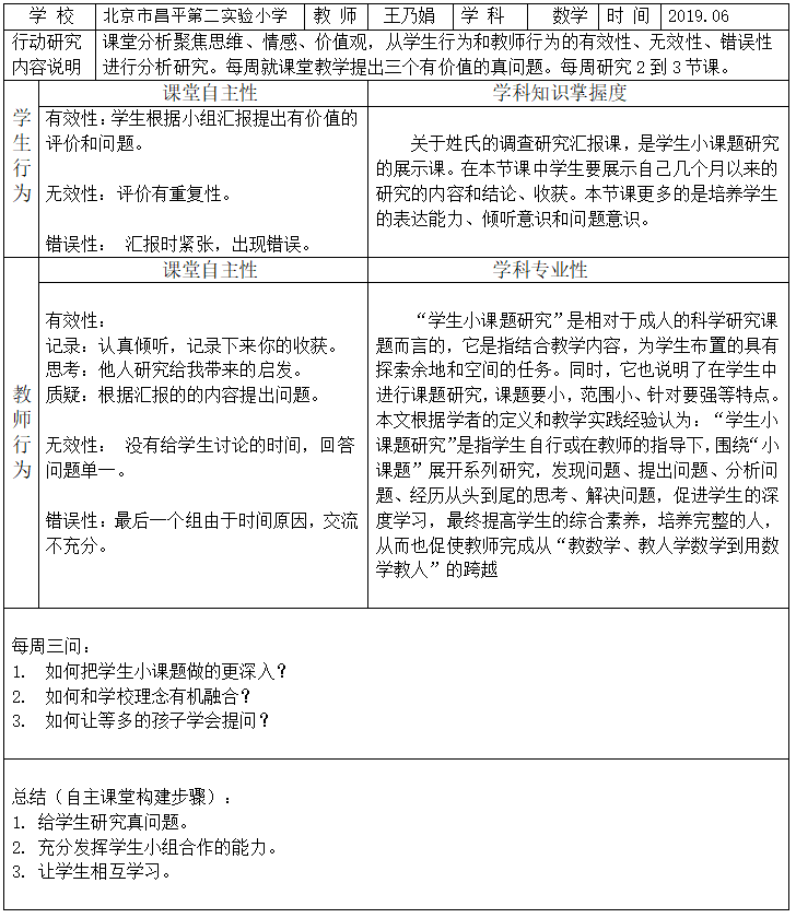 王乃娟,北京市昌平第二实验小学的一名数学老师。13年的教学经验,王老师善于思考,善于总结。对于“自主教育”,王老师认为自主教育应从生命内在成长与发展出发,让教育润泽每一个生命。