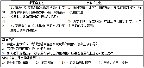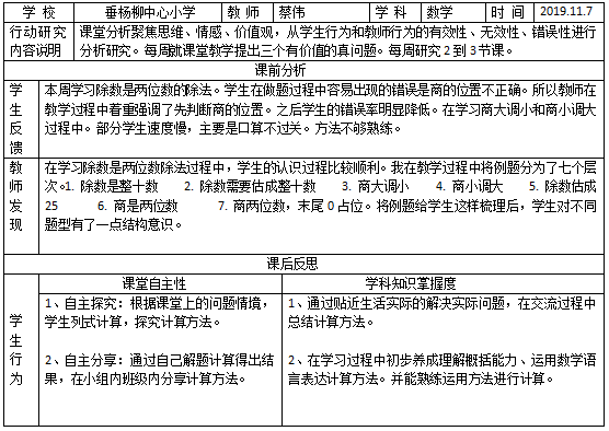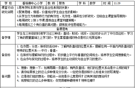 教师介绍 蔡伟 蔡伟,是北京市朝阳区垂杨柳中心小学的一名数学老师。从事教师这个行业,今年是第五个年头。如今,蔡老师对教学有了一定了解,对于如何在教学中让学生有学习的动力,喜欢上与同学合作学习的过程是蔡老师一直在努力思考的问题。对于自主,蔡老师认为自主教育的关键,是体现一个探究,研究,讨论的氛围。教师和学生作为一个融洽的整体,从存在主次和上下的关系转变为平等交流。 学习心得分享 读《浅谈小学数学教学中学生自主学习能力的培养》有感 《浅谈小学数学教学中学生自主学习能力的培养》一文中作者介绍了他所理解的重点过程。 有如下几个方面: 一、为学生营造良好的教育氛围,激发学生学习的积极性 在课堂中运用直观形象和具体材料设置问题、故事等教学情景,可以 激发学生对知识的好奇,从而增加学习的兴趣。 二、引导激励,培养学生的自信心 学生没有自信,学习上就不可能真正做到“自主”,“自信”是学生学好数学最基本的心理条件。 三、精心设计课堂教学过程,培养学生自主学习能力 学生的数学学习内容应当是现实的、有趣的、具有挑战性的,这些内容有利于学生主动的从事观察、实验、猜测、验证、推理与交流等数学活动,也容易激活学生已有的生活经验和数学知识,激发学生的学习愿望。在课堂中要用教材教,而不是教教材,要让学生学习适合自身发展需要的、有价值的数学,而教师在教育教学过程中,又要注意揭示数学的价值在于解决生活中的问题,这样更能激起学生学习的欲望。 四、适时启发点拨,引领学生自主探索 教学中的点拨,一是要“准”,要在学生思维的堵塞处、拐弯处予以指导;二是要“巧”,在学习有困难学生茫然不知所措时,在“后进生”有强烈求知欲望时,在中等生“跳起来想摘果子”力度不够时,在“优等生”渴求能创造性地发挥其聪明才智时巧以点拨,使其茅塞顿开、豁然开朗。 五、授人以渔,教给学生数学思维的方法 交给学生数学思维的方法,注重提高学生的数学能力,是在小学数学教育中实施素质教育最现实的目标和具体途径。 反思我在日常教学中,在各方面都需要有一定的改变。每个方面都关注到了但都是强化的不够。 实际改变: 我思考从三个方面做出改变。 一、关于第四点:适时启发点拨,引领学生自主探索。关键课堂中,设置分层问题,帮助学生理解,增加参与感。 二、教给方法是解决问题的过程,教给原理是解决问题的依据。关注理的教学。 三、关注学生自主学习能力。 行动管理表分享 蔡老师的行动管理表 |